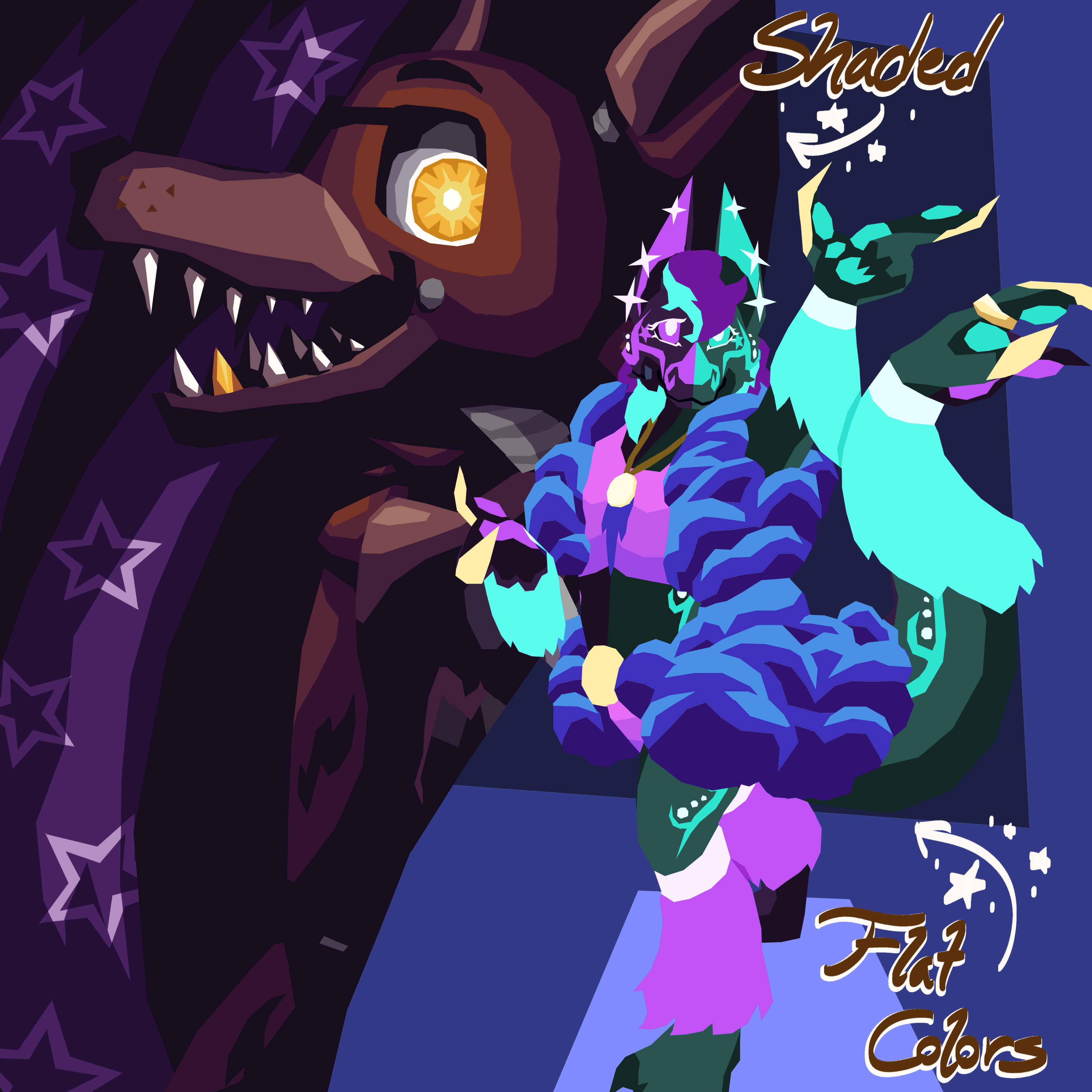 I'll color in the flat colors, if the piece is for Flat Colors, I will add lines to distinguish parts of the same color if there isn't any linework. I will usually also work on the background during this phase.